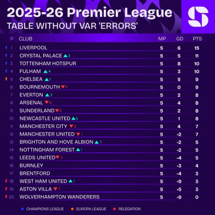 无VAR误判的英超积分榜显示,利物浦以15分高居榜首,展现了他们的实力与韧性。紧随其后的则是水晶宫,以11分的佳绩稳坐第二的位置,似乎在这个赛季中,他们的潜力被重新发掘。之后的热刺与富勒姆同样表现不俗,各自以10分并列排名,展示出竞争的激烈。