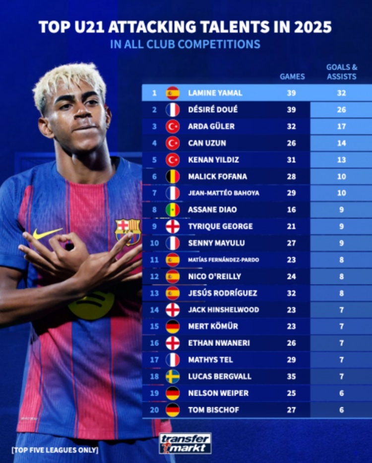 近日,德国转会市场发布了一项引人注目的统计,列举2025年各俱乐部赛事中进球最多的U21球员。在这份榜单中,来自巴萨的亚马尔以令人瞩目的39场比赛打入32球,牢牢占据了第一的位置。而巴黎圣日耳曼的杜埃则凭借39场26球紧随其后,展现出他的出色进攻能力。