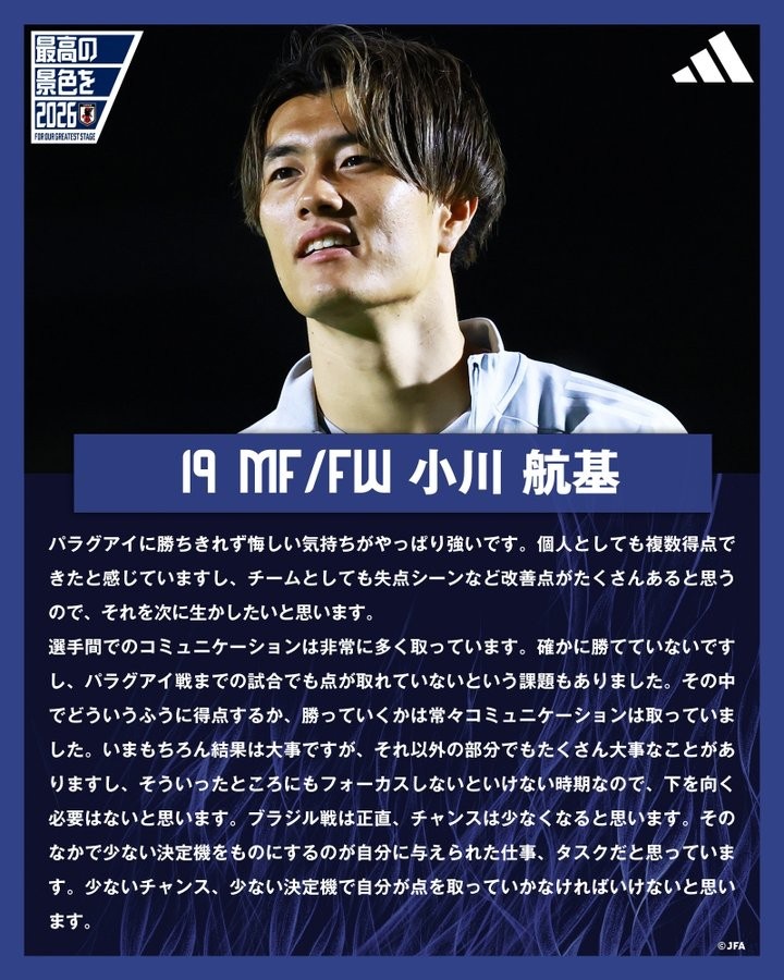 谈到即将到来的对手巴西队,小川航基知道与这种强队的对抗并不容易:“与巴西的比赛机会将会非常有限,因此如何在少数机会中把握住并进球是我作为前锋的使命。虽然机会可能稀缺,但我必须努力确保能够把握住每一次破门的机会。”