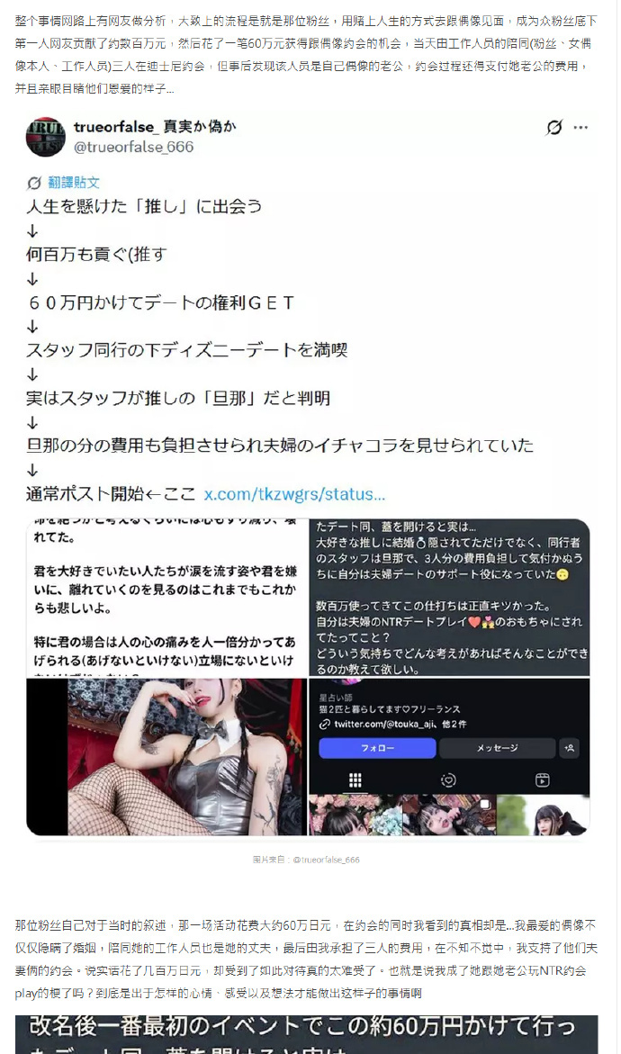 有趣的是,当天他们的总消费额达到60万日元。这位粉丝感慨,自己像是在参与一场NTR(即“寝取られ”,意为“被夺走”)题材的约会游戏,既感到心痛又莫名其妙。不少人可能对此感到难以理解,但这实际上反映了日本偶像产业特有的一种文化现象。在这个文化中,偶像与粉丝之间仿佛建立了一种近乎亲密的关系,部分粉丝通过支付费用,尝试获取与偶像的“专属互动”。
